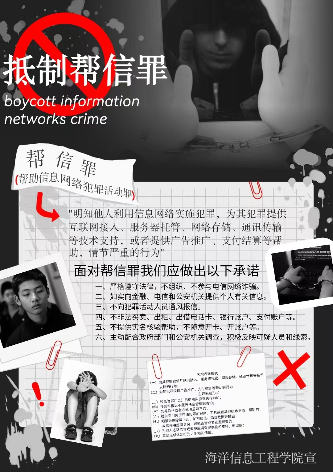 公司高度重视“防范帮信罪”安全教育,院学工办认真部署,张贴了有关防范抵制“帮信罪”的宣传教育海报。班主任通过班会详细介绍了什么是“帮信罪”?并结合案例,介绍了不法分子作案手法,班会上宣读并要求全体同学签署《抵制帮助信息网络犯罪活动罪》承诺书,增强防范并抵制帮信罪的安全意识,强化法治观念,为促进海南自由贸易港的建设贡献老员工的青春力量!